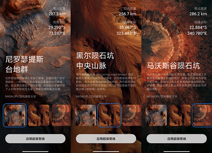 目前超级壁纸一共提供2套共计6个地点,火星、地球各三个。火星上提供的是尼罗瑟提斯台地群、黑尔陨石坑中央山脉、马沃斯谷陨石坑。