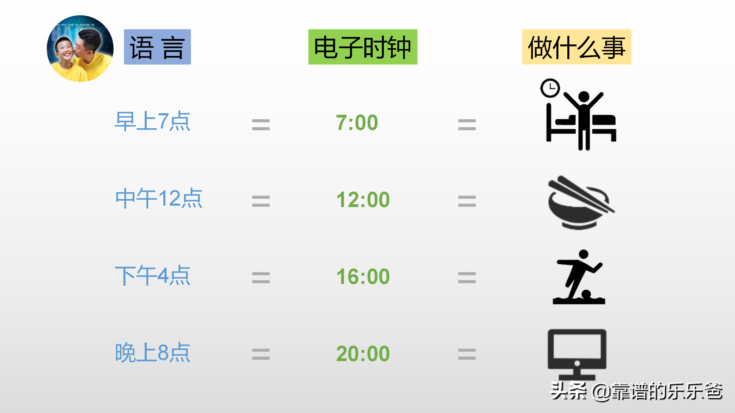 正确的做法请看下图,应该通过直观的钟表或电子钟的数字,直观的让孩子和所要做的事情画上等号,不断地重复训练,7:00=起床,12:00=吃饭,16:00=锻炼。