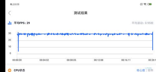 使用《绝地求生:刺激战场》测试,小米9SE最高开启高清画质,高帧率模式下,小米9SE平均帧率维持在29帧,波动帧率0.95帧,只是在开始和结束时波动较大,整个游戏过程中无论是开枪还是跳伞或者开车等渲染比较大的场景下也没有卡顿现象,整体表现还是非常不错的。
